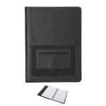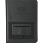 The Greenville junior padfolio features a soft leatherette cover and a front elastic pocket, pen loop and card pocket. The inside cover includes a handy phone stand, four interior pockets, and elastic loops for your accessories such as earbuds, small power banks and cords. There are also a spiral bound A5 journal with 80 lined sheets and a pen loop. Complies with Prop 65. 6 3/4″ W x 8 7/8″ H x 3/4″ D