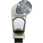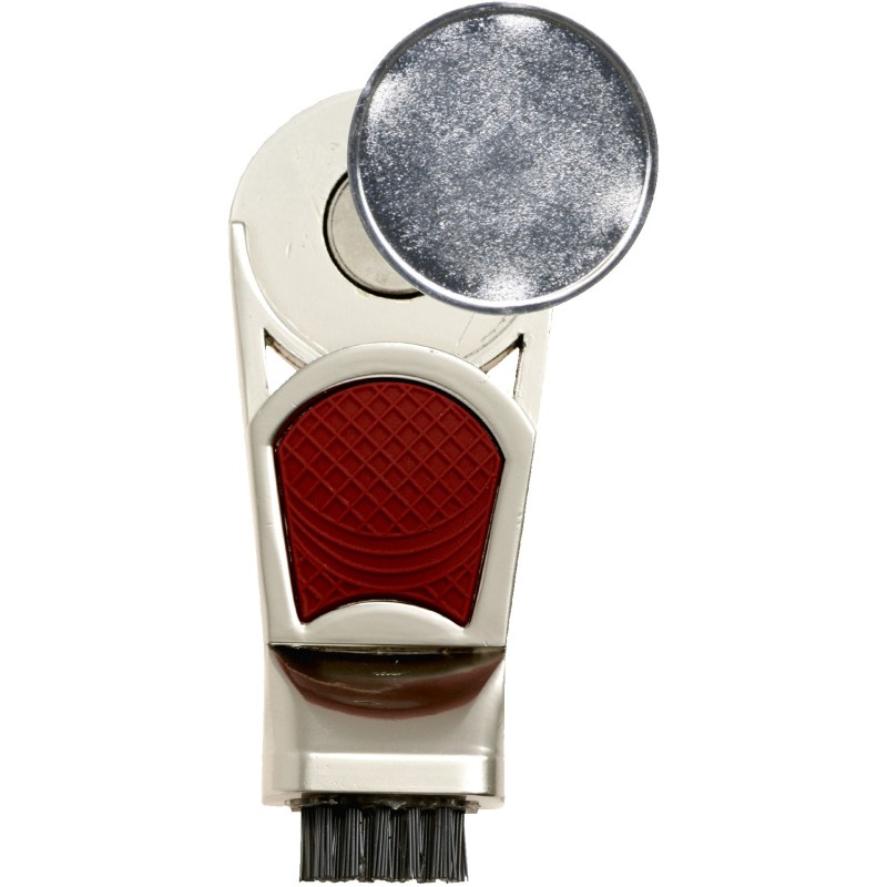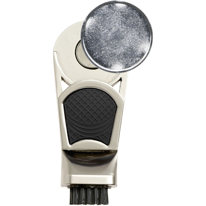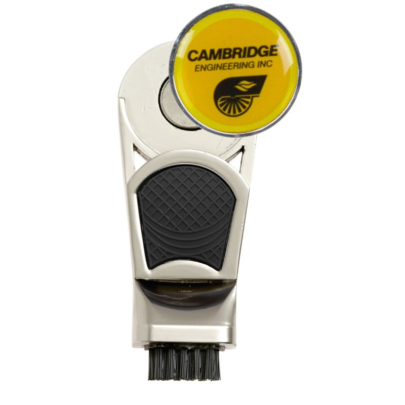 Please Note: If your artwork has a white background, the color of the actual artwork may give the appearance of tinting the color of the white due to light reflection. Example: White with red art may make the white appear to be pink. Pocket friendly accessory complete with rigid brush for club head cleaning and removable 1.0 ball marker. Contemporary all metal design. Choose from six colored shield insert options to maximize your exposure. Matte nickel finish. Complies with Prop 65. 1″ H x 2.75″ W