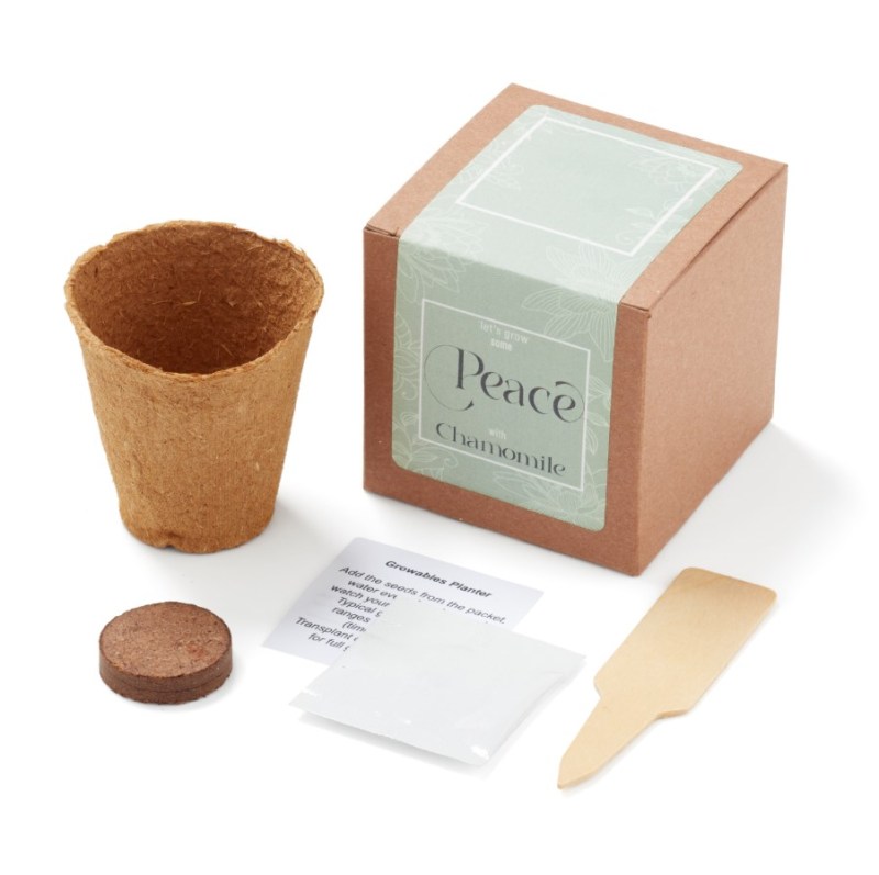 Tend to the seeds of your next promotion with a gift of the Grow Some Peace Planter Set. This kit features a fiber pot made of 100% organic and biodegradable materials, an easy planting soil pod, chamomile seed packet and a wooden gardening stake. The spruce wood planter is manufactured without glue, so it can be transplanted directly into a window box, larger pot or outdoor garden when the seeds germinate in two to three weeks. Customize the recycled kraft material gift box with one of our stock labels. 3″ D x 3″ W x 3″ H