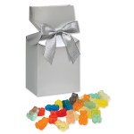 It’s impossible not to be cheerful while enjoying these fruity, chewy, authentic gummi bears! Featuring twelve delicious flavors, including unique options like mango, pineapple, and watermelon, these are sure to charm every recipient. The silver gift box is foil-stamped wth your logo in black and filled with one-half pound of these delightful candies. Complies with CPSIA, FDA, Prop 65. 3.5″ L x 2″ W x 6″ H
