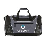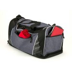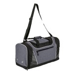 Heathered 300D/600D polyester two-tone duffel bag with deco stitching with wide mouth opening main compartment for easy packing. Shoe pocket with ventilation grommets; front zipper pocket; wrapped handles with hook and loop closure; adjustable shoulder strap. 10″ D x 10.5″ H x 22″ W
