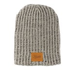 Behold, the solution to bedhead, cold AF winter mornings, and stale marketing: our Haberdasher knit beanie with a leather patch. This keepsake is something people actually want to wear and an ideal promo item for the cool-kid crowd. Make your beanie your own by choosing between one of our USA-made leather color options to show off your logo. While the natural leather will vary slightly in texture and color, this rugged beanie will stay fresh season after season. Complies with Prop 65. 7.84″ W x 13.267″ L
