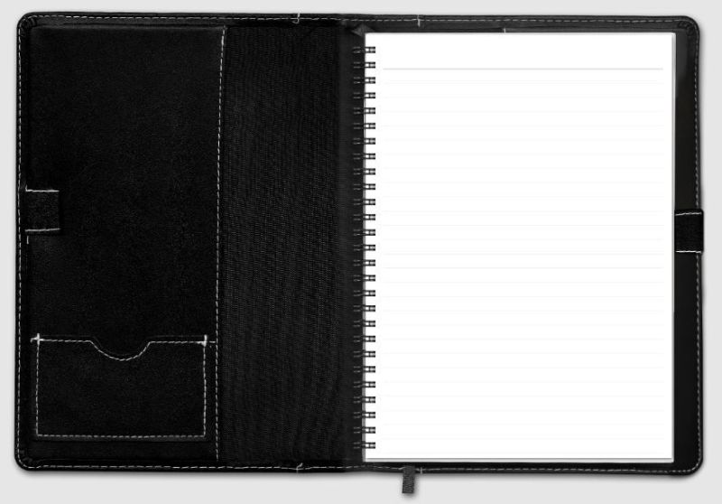Nothing balances the relaxed and the refined like the Hampton. A refillable USA 70-sheet, wire-bound journal is tucked inside. Also includes a double pen loops, a business card pocket, front and back pockets, black wire binding and a ribbon page marker. The outer cover accepts a blind deboss and a pre-production proof is highly recommended. Complies with FSC. 7″ W x 9″ H