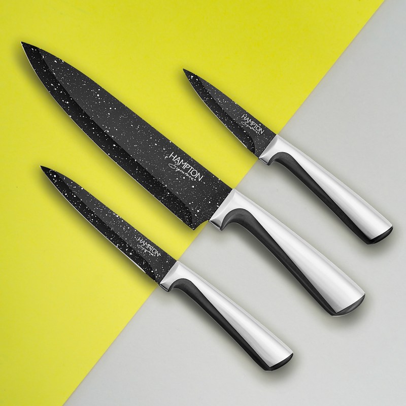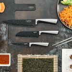 High quality Stainless Steel. Mirror polish, gunmetal speckled Stainless Steel blades. Satin polished, ergonomically designed handles with black accents. Set includes 8″ chef’s knife, 8″ bread knife, 5.5″ Santoku knife, 5″ utility knife, (6) 4.5″ steak knives, 3.5″ paring knife, 3″ Bird’s Beak knife, and wooden knife block. Hand wash recommended. 25-year limited warranty. 5.5″ D x 4.5″ W x 13.75″ H