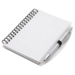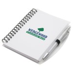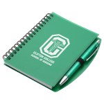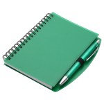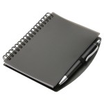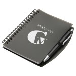Hardcover Notebook & Pen set is spiral bound vinyl cover notebook featuring a color matched ball point pen, with black ink, inserted in the elastic pen loop and has 50 sheets (100 pages) of white ruled paper. Complies with Prop 65. 5.25″ L x 0.625″ W x 6.125″ H