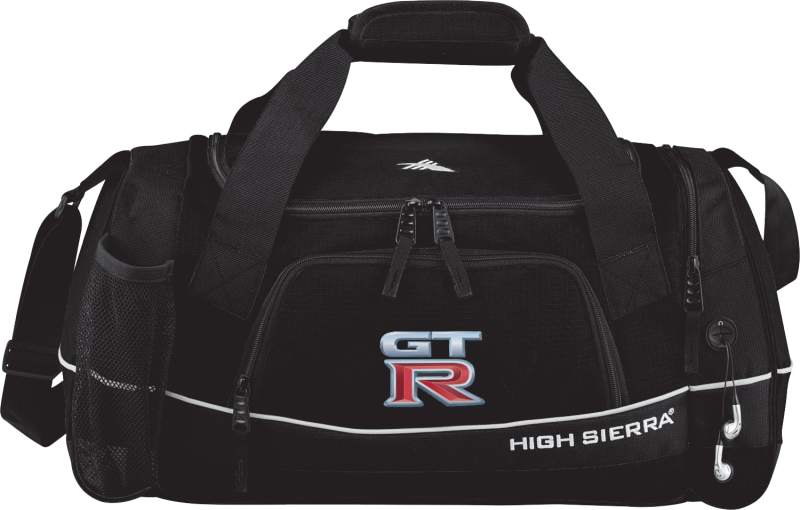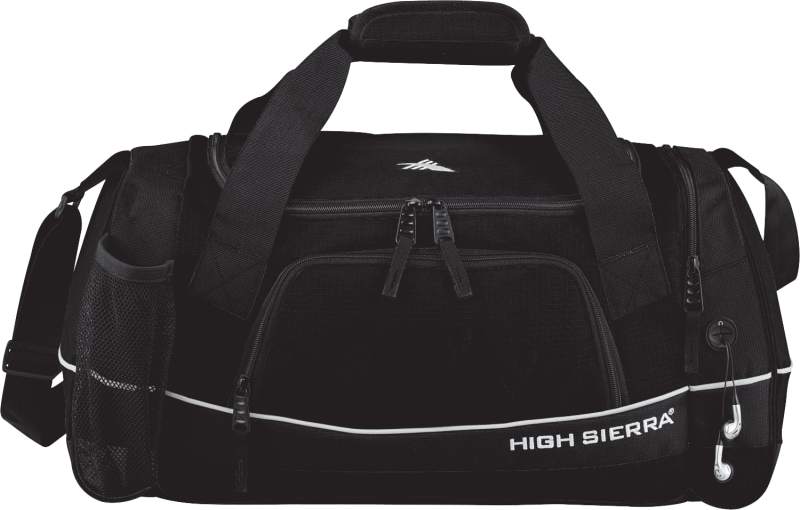 The High Sierra Bubba Duffel bag includes a large main compartment with U-shaped zippered opening and a zippered end pocket with a media pocket and headphone port. Store your water in the mesh water bottle pocket. This custom duffel bag includes handles with durable webbing and neoprene wrap to wick moisture. The High Sierra Bubba Duffel includes an adjustable padded shoulder strap and self-repairing nylon coil zippers. The High Sierra Bubba Duffel bag is covered by a lifetime warranty. 9.50″ D x 10.00″ W x 22.00″ H