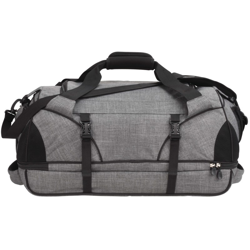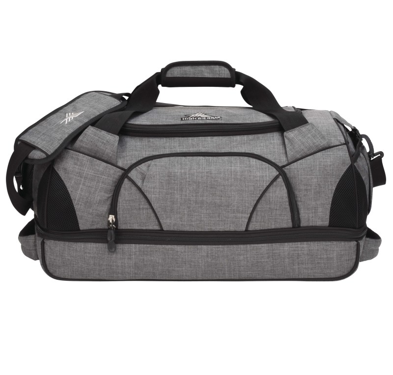 The High Sierra Crunk Cross Sport Duffel Bag includes a zippered main compartment with U-shaped opening and front pocket with deluxe organizer and headphone port. This sports duffel features a wet compartment with a zippered divider panel to create a large compartment to store sportswear and accessories. The High Sierra Cross Crunk Sport Duffel includes a water bottle pocket, accessory pockets, and is covered by a lifetime warranty. 24.00″ D x 12.00″ W x 12.00″ H