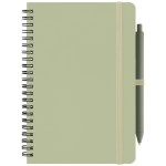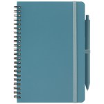 The Höga Repreve Spiral Jotter Notepad – A5 is a practical set featuring an A5 notebook with a cover made from Repreve recycled ocean-bound plastic. It includes 60 lined sheets (120 pages) of 70 gsm ivory paper sourced via responsible forestry, bound with a sturdy black-painted steel double spiral. The notebook is secured with a color-matched elastic strap and pen loop, attached to the back cover with a silver rivet. The included retractable pen is molded from RABS plastic with a rubber finish for a comfortable grip. Note: only the notebook is printed, not the pen. Complies with Prop 65. 7.87″ H x 5.59″ W x 0.24″ D