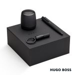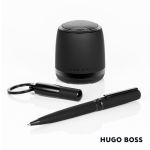 This Hugo Boss set consists of a connected speaker, a key ring, and a ballpoint pen. Ultra-light and hyper-functional, the loudspeaker from the Hugo Boss Gear Matrix collection is an indispensable accessory for your everyday life. Whether you’re at home, in the office, on the road or on vacation, you can’t live without it. With its wireless connectivity technology, pair any mobile device and listen to your favourite music or radio, take a call and make conference calls with ease without having to use your mobile phone. The Gear Matrix keychain comes in a tubular shape and plays on the contrast between an eraser-finish lacquer and matte black metal inserts with the finely engraved HUGO BOSS signature. The “Gear Matrix” ballpoint pen is distinguished by its bright, contrasting colors. 6.5″ W x 6.75″ H x 2.75″ D