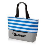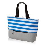 600D Polyester striped cooler bag- Heat sealed and leak resistant insulated interior- Ultra padded foam insulation- Zippered pocket on base- Durable nylon carry handlesProduct Size: 14″ x 21″ x 5″. 14.0″ W x 21.0″ H x 5.0″ D