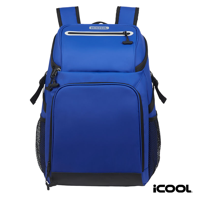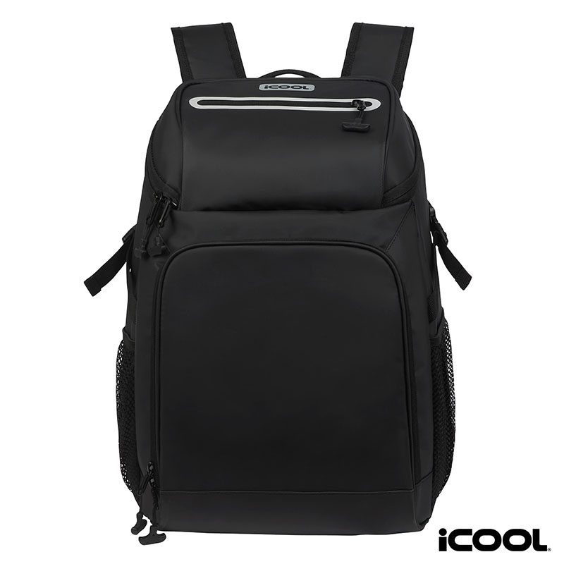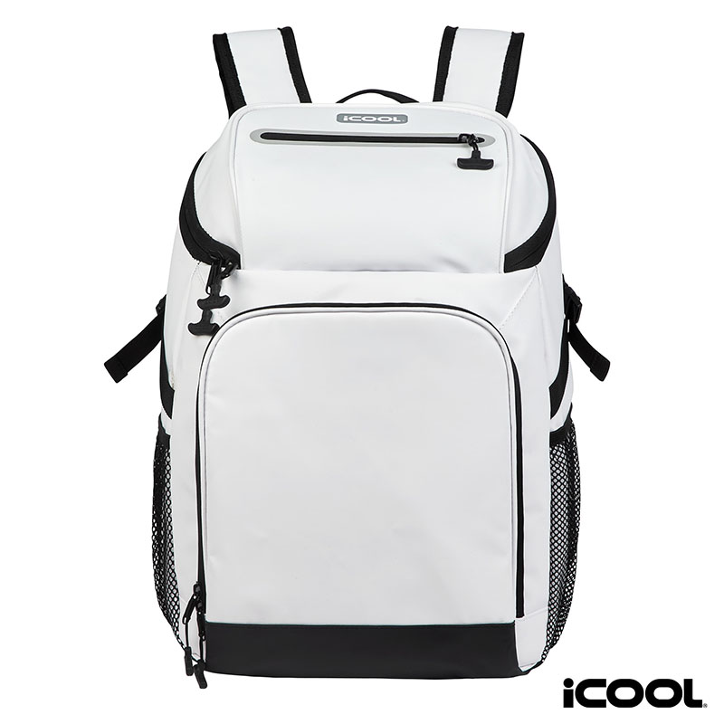 This 20-Can Cooler Backpack from the iCOOL Vail Series is the perfect blend of style and convenience, making it an ideal companion for your next adventure. Rugged construction with its water-resistant tarpaulin exterior and clean lines add to the appeal of this practical and stylish bag. Its spacious main compartment is deep enough to hold upright wine bottles and features thick foam insulation and heat-sealed PEVA lining to keep your items cool, it also has a large front zippered pocket, 2 sid. Complies with Prop 65. 11″ W x 15 1/2″ H x 7 1/2″ D