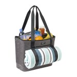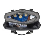 The ultimate carryall cooler. Dual compartment functionality includes both insulated and dry storage. Bottle opener conveniently attached for on-the-go use. Front straps adjust to secure blanket or towel. Trolley strap feature slips over luggage handle for easy transport. Front zippered pocket for additional storage. Dual carry handles. EPPE heat-sealed lining. PVC free. Phthalate free. 20 can capacity. Complies with CPSIA, Prop 65. 7″ W x 14″ H x 17″ L