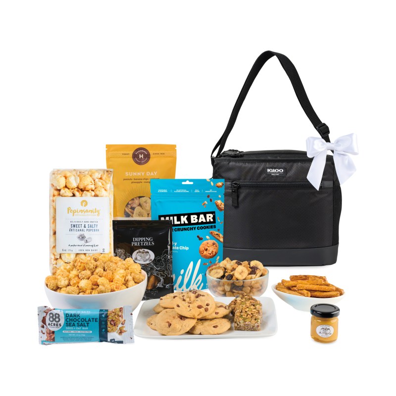 Celebrate Good Times with this stylish Igloo(R) Maddox Deluxe Cooler that arrives bursting with an abundant array of marvelous gourmet treats nestled inside. Cooler includes Hammonds(R) Sunny Day Super Snack Mix (7.5 oz), Hammonds(R) Sweet & Cheesy Popcorn(5 oz), Milk Bar Crunchies Pretzel-y Chocolate Chip Cookies Pouch, 88 Acres Dark Chocolate Sea Salt Seed Bar (1.6 oz), East Shore Sween N’Tangy mustard (1.5 oz) and dipping pretzels (2 oz). Complies with CPSIA, Prop 65. 8″ W x 10.5″ H x 12″ L