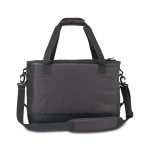 Dual zippered, pull handle opening with folding lid for easy access to main compartment. Dual side grab handles for easy carrying. Carabineer bottle opener attached for on-the-go use. Base is wipeable, coated material. Front zippered pocket for additional storage. Dual carry handles with padded handle wrap. Adjustable, removable shoulder strap with pad. EPPE heat-sealed lining. PVC free. Phthalate free. Patented design. 42 can capacity. Complies with CPSIA, Prop 65. 7″ W x 13″ H x 18″ L