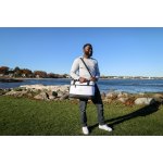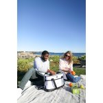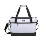 Dual zippered, pull handle opening with folding lid for easy access to main compartment. Dual side grab handles for easy carrying. Carabineer bottle opener attached for on-the-go use. Base is wipeable, coated material. Front zippered pocket for additional storage. Dual carry handles with padded handle wrap. Adjustable, removable shoulder strap with pad. EPPE heat-sealed lining. PVC free. Phthalate free. Patented design. 42 can capacity. Complies with CPSIA, Prop 65. 7″ W x 13″ H x 18″ L
