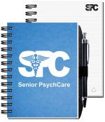 Our Impression Journal features a durable, thick, 50 pt. smooth cover stock and 80 pages of recycled 60 Lb. white offset inside sheets with black logo and rules, graph, or euro dot printed on the front of each sheet. Recycled symbol is printed in the lower right corner and the back of each sheet is blank. Comes Wire-O bound on the left side in black with a 3 year calendar insert, pen safe back, and a pen. 5″ W x 7″ H