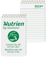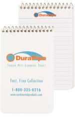 This notebook features a white 10 pt. cover that is spot printed with a clear coat on 1 side of the front and/or back cover. Includes 50 Lb. white offset sheets with rules and a custom logo printed on 1 side of each sheet in 1 color. Comes coil bound on top. 2 7/8″ W x 4 3/4″ L