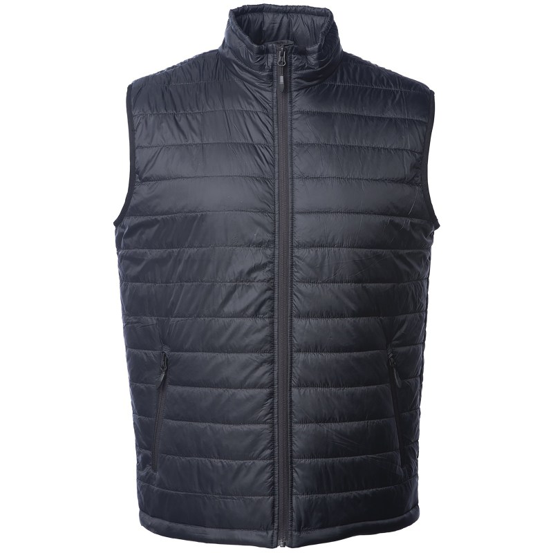 Water & wind resistant 100% Nylon exterior shell. 60 gm Hyper-Loft poly fill insulation. 100% polyester lining. #5 reverse coil zippers at chest and pockets. Packable pocket with #3 reverse coil zipper. Capped elastic armhole binding. Locker loop at wearers back neck. Plastic cinche toggle at wearers right side waist. Tear away neck label. Chest pocket for concealed embroidery access.