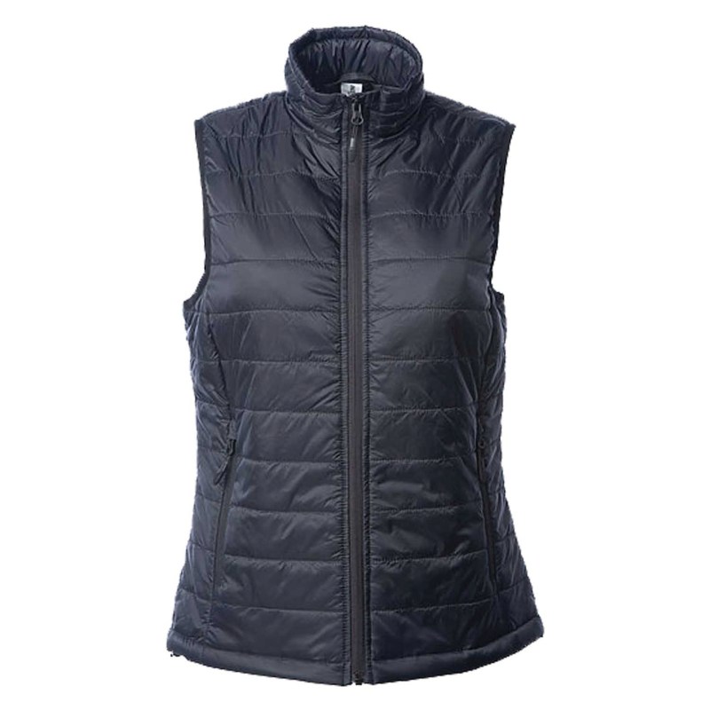 Features reverse coil zippers at chest and pockets, packable pocket with reverse coil zipper, capped elastic armhole binding, lockerloop at wearers back neck, plastic cinched toggle at wearers right side waist, and chest pocket for concealed embroidery access. Complies with Prop 65.