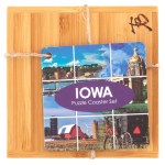 This State Puzzle Coaster Set with Case offers a natural solution for protecting tabletop. These sturdy coasters are crafted from organically-grown Moso® bamboo, an environmentally-friendly material solution that quickly re-grows once harvested. Bamboo is both lightweight & durable a perfect choice for coasters! The coaster set includes a handsome case to store coasters neatly when not in use. The coasters are easy to care for as well: simply wipe them with a damp cloth to clean. Complies with Prop 65. 4″ W x 4″ H