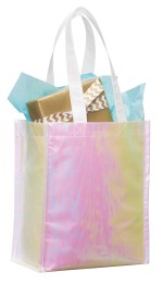 Surprise a friend, employee, or loved one with the Iridescent Non-Woven Gift Tote, which features lightweight polypropylene construction. Its open main compartment provides ample on-the-go storage while its built-in handles offer a comfortable grip. This trendy tote bag is perfect for carrying powerbanks, wallets, books, smartphones, snacks, and all your other essentials. 4.75″ D x 9.00″ W x 10.75″ H