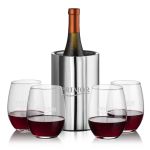 Sleek and Polished Stainless Steel Wine Cooler. Fits a standard 750ml bottle and is a great way of promoting your brand or message. The beautiful set with 2 or 4 matching stemless Stanford wine glasses is an excellent gift for the holidays or as a token of your appreciation.