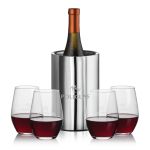 Sleek and Polished Stainless Steel Wine Cooler. Fits a standard 750ml bottle and is a great way of promoting your brand or message. The beautiful set with 2 or 4 matching stemless Vale wine glasses is an excellent gift for the holidays or as a token of your appreciation.