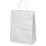 The Jenny White Shopper is made with white kraft paper and features twisted paper handles and a serrated cut top. 10″ W x 5″ D x 13″ H