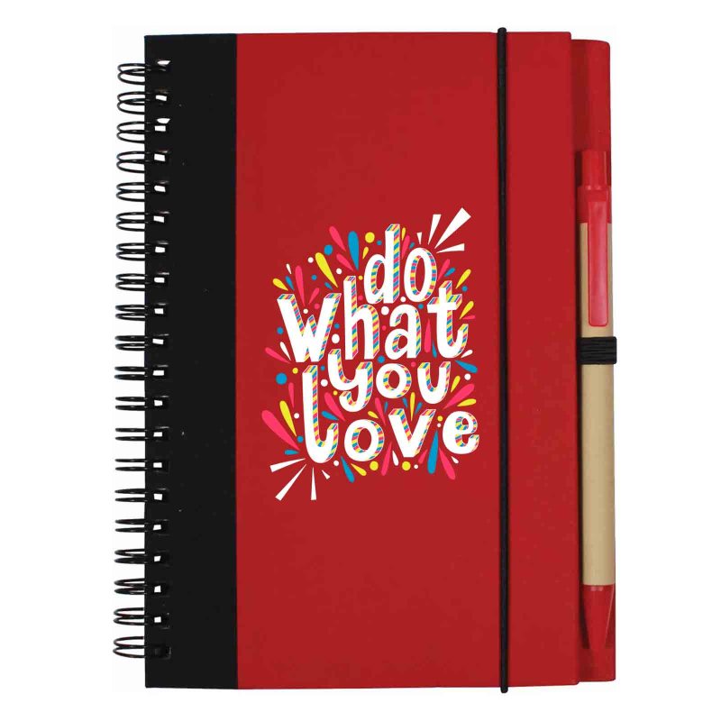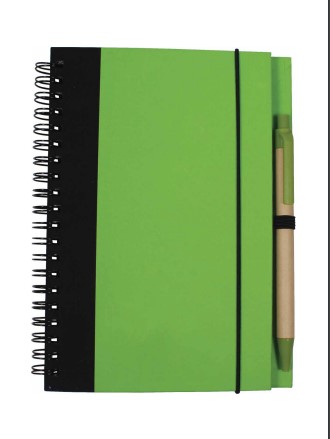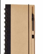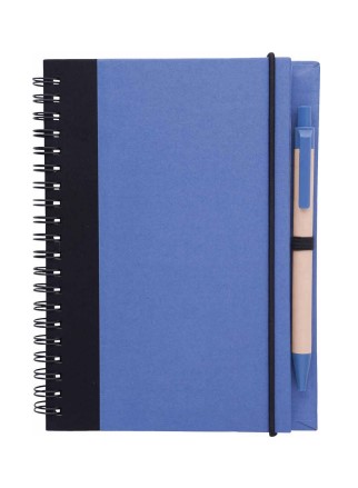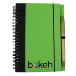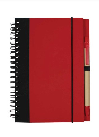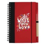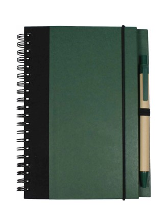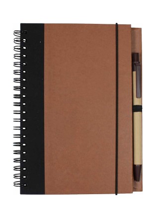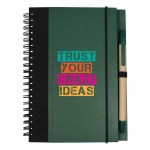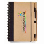 This eco hardcover journal could do wonders for your brand! It comes with a matching pen and sheets of 100% recycled, lined paper (not refillable). This features a metal spiral which is 80% recycled, and black fabric accents made from 80% post-consumer recycled materials. This is great for students, professionals, or anyone else who needs to take down notes. Add your company name or logo and show that you care about your customers and the environment! Complies with Prop 65. 5″ W x 7″ H