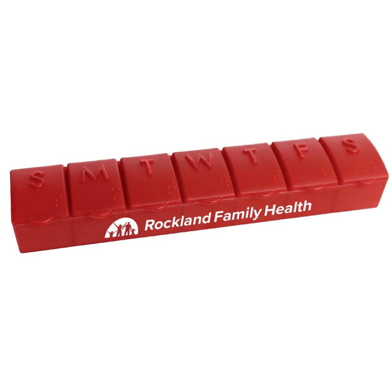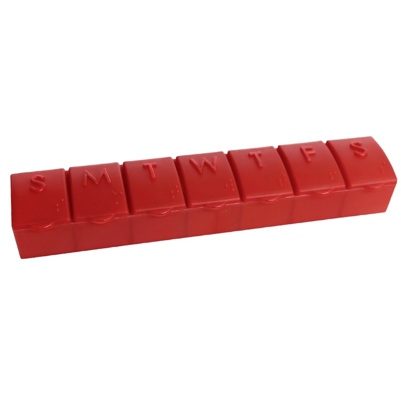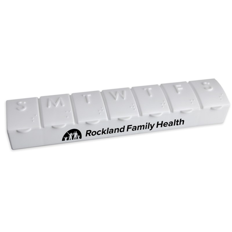 Extra Large Seven day pill case with raised letters for days of the week and brailleGreat for promotion of healthcare?businesses. Complies with ANSI, CPSIA, FDA, Prop 65. 1″ H x 8.375″ W x 1 5/8″ D