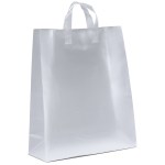 Frosted hi-density plastic bag is made with fused loop handles and a cardboard bottom insert. 16″ W x 6″ D x 19″ H