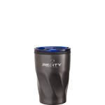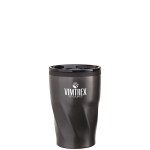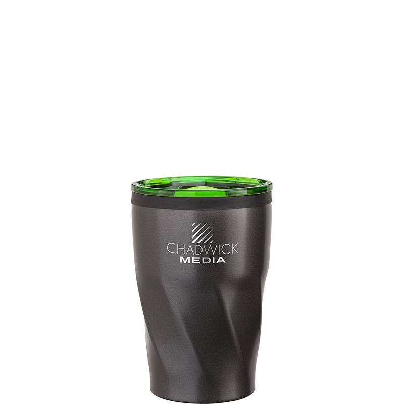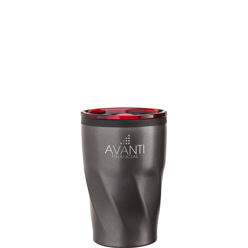 The Kaf 12 oz. coffee tumbler is the perfect fit for most single serve coffee brewing systems. The double wall construction with a stainless steel outer wall protects your hand from the heat while you enjoy a cup of joe. The translucent colored easy sip lid with a silicone ring and sliding opening to prevent spillage, couples with the attractive gunmetal coating and comfortable twist grip. This cup’s non-slip base makes it the perfect desk companion, or take it in your car as it fits most car. Complies with Prop 65. 3 3/8″ W x 5 1/8″ H x 3 9/16″ D