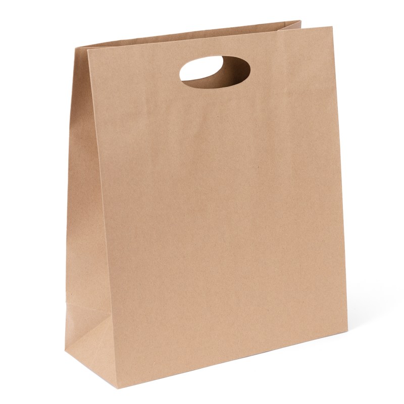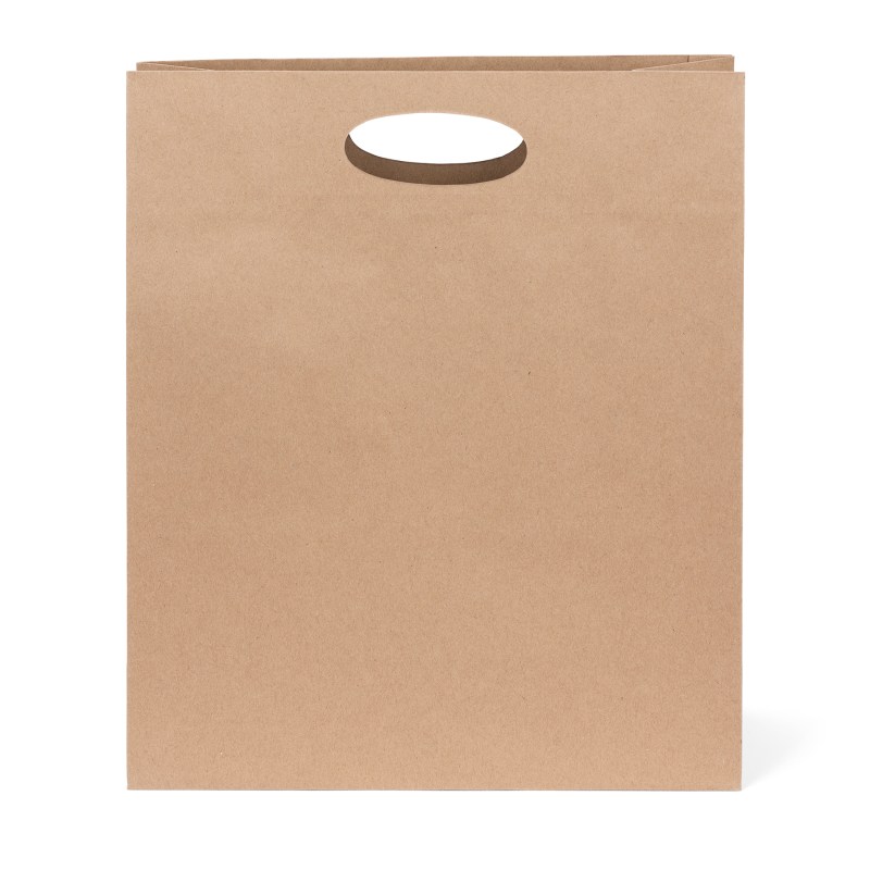 The Eco Die Cut Shopper bags are made with 100% recycled paper with a minimum of 60% post consumer content. The bags feature 140 GSM Eco kraft paper and die cut handles. Complies with CPSIA, C-TPAT, FDA, Prop 65. 12″ W x 14″ H x 5″ D