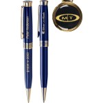 Twist retractable executive pen in deep corporate colors with 24 Karat gold-plated accents & full color photo dome. Highest quality jumbo black ink cartridge. Complies with Prop 65.