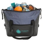 This premium cooler tote is made of easy-to-wipe-clean tarpaulin material and features a heat-sealed PEVA liner, front zippered pocket, and 20-can capacity. Adjust to the size you want with the side snap tape at the top corners. 13.5625″ W x 18.5″ H x 5.9375″ D