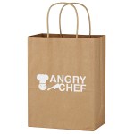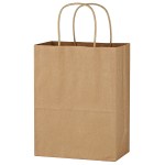 Made Of Kraft Paper. Serrated Top. 4 ¾” Gusset. Reusable. Recyclable. Matching Kraft Twisted-Paper Handles. Complies with Prop 65. 4.75″ D x 8″ W x 10.25″ H
