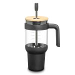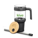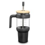 Stay hydrated on the go with this 40oz Lanai Glass Travel Mug w/Straw, designed with a convenient handle and a tapered bottom to fit most cup holders. It features a bamboo lid and a silicone sleeve for a stylish, comfortable grip, plus a stainless steel straw with a silicone tip for easy sipping. Perfect for eco-conscious consumers, this tumbler combines function and sustainability in one sleek design. Suitable for cold beverages only. Measurements on the mug are pre-printed.Product Size: 6″ W x 12″ H x 4″ D (with straw and handle). 6.0″ W x 12.0″ H x 4.0″ D