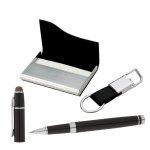 The Langley classic business gift set includes an elegant rollerball pen, a business card holder and a keychain. The cap-off rollerball pen features etched decorative rings and a capacitive metal fiber stylus for touch screen devices. The business card holder has a metal exterior with a black leatherette hinged magnetic lid, and a soft black velvet interior. The stylish keychain has a black leatherette strap with a traditional split ring as well as a swivel design hook. This 3-piece business gift set is a perfect gift for a client and is beautifully enclosed in a hinged-lid black gift box with crinkle paper filler. Complies with Prop 65. 7 1/8″ W x 7 1/4″ H x 1 13/16″ D