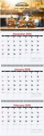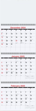 This calendar features a white paper board back coated on 1 side with 3 calendar pads printed in black and red ink only on white offset paper. Includes 14 months (December to January) with American Holidays. Calendar pads are black Wire-O bound into the board and have tear-away sheets to allow 3 month visibility at the same time. Folds to 10 ¾”x 9 ¾”. Each calendar pad measures 10 ¼”x 8″. 10 3/4″ W x 33 3/4″ L