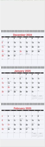 This calendar features a white paper board back coated on 1 side with 3 calendar pads printed in black and red ink only on white offset paper. Includes 14 months (December to January) with American Holidays and an apron. Calendar pads are black Wire-O bound into the board and have tear-away sheets to allow 3 month visibility at the same time. Folds to 10 ¾”x 10 ¼”. Each calendar pad measures 10 ¼”x 8″. 10 3/4″ W x 35″ H
