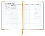 Textured, faux leather hard covers available in Black, Blue, Orange, Red, and Lime. Includes a blind deboss imprint and a 12-month, digitally-printed calendar at front (13 sheets). Contains 80 sheets of wood-free lined filler, an inside back cover pocket, matching satin ribbon bookmark, elastic privacy closure, and thread-sewn book binding. Imported book, decorated in the USA. 7″ W x 10″ H