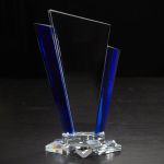 Angled blue accents make this piece stand out among the rest. Large imprint areas and steady clear bases finish out the piece. 6.375″ W x 11.125″ H x 3.5″ D