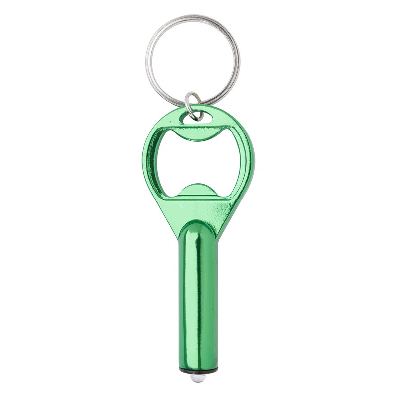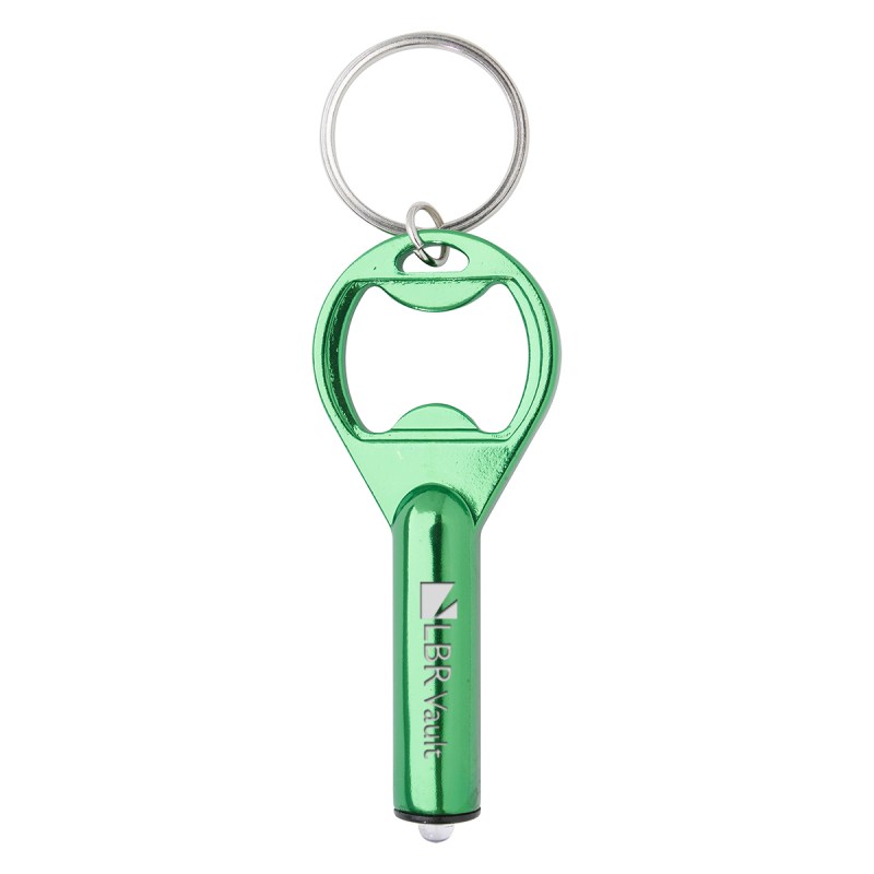Extra Bright White LED Light. Push Button To Turn On/Off. Metal Bottle Opener. Split Ring Attachment. Button Cell Battery Included. 4.25″ H