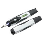 Pocket clip, Bright LED light, Liquid level, Two dual end bits: – 2 Phillips- 2 flathead, powered by 1 button cell battery, inserted. Complies with Prop 65. 5.5″ L x 0.75″ W x 1″ H