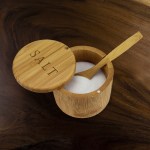 Beautifully crafted bamboo box is an ideal place to store up to 6 ounces of table salt, gourmet salt, herbs or favorite seasonings in the kitchen. Includes a bamboo serving spoon to dole out just the right amount of salt or spice. The ingenious magnetic lock & swiveling lid design makes it easy for busy cooks to grab a pinch of seasoning with just one hand. The lid features a laser engraving of “Salt” on the lid. Hand wash with warm water & mild detergent. Complies with Prop 65. 2 3/4″ H x 3 1/2″ Diameter