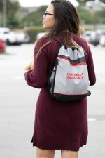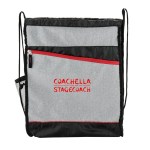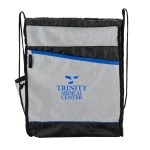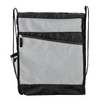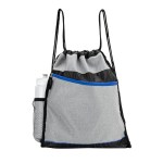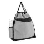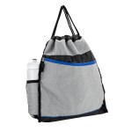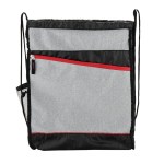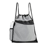 Knitted fabric and 210/PU drawstring sports pack with accent color zipper and piping. Front angled zipper pocket; side mesh water bottle pocket; gusseted sides. 4.5″ D x 16.9375″ H x 13.75″ W