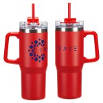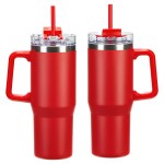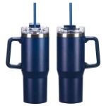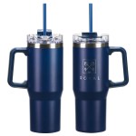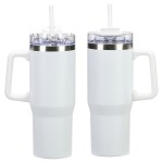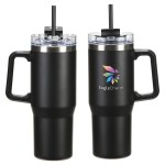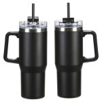 Enjoy refreshment on the go with our Maestro 30 oz Vacuum Insulated Stainless Steel Mug. It features a clear screw-on plastic lid with a leak-resistant high wall, ensuring no spills. The sturdy black plastic handle makes for easy carrying, while its design fits most car and truck cup holders. Ideal for keeping beverages hot or cold for up to 6 hours, this tumbler is BPA-free and FDA certified for safety. Hand wash only. Complies with FDA, Prop 65. 9.5″ H x 3.5″ Diameter