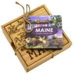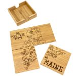This State Puzzle Coaster Set with Case offers a natural solution for protecting tabletop. These sturdy coasters are crafted from organically-grown Moso® bamboo, an environmentally-friendly material solution that quickly re-grows once harvested. Bamboo is both lightweight & durable a perfect choice for coasters! The coaster set includes a handsome case to store coasters neatly when not in use. The coasters are easy to care for as well: simply wipe them with a damp cloth to clean. Complies with Prop 65. 4″ W x 4″ H