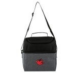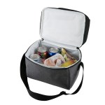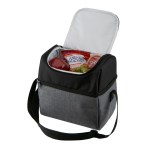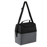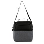 600D/300D two-tone polyester cooler bag with PEVA lining and 5mm PE foam padding. Zip around main compartment; top zip pocket lid; adjustable shoulder strap; two-tone wrapped top grab handle. 6.875″ D x 10.25″ H x 10.25″ W