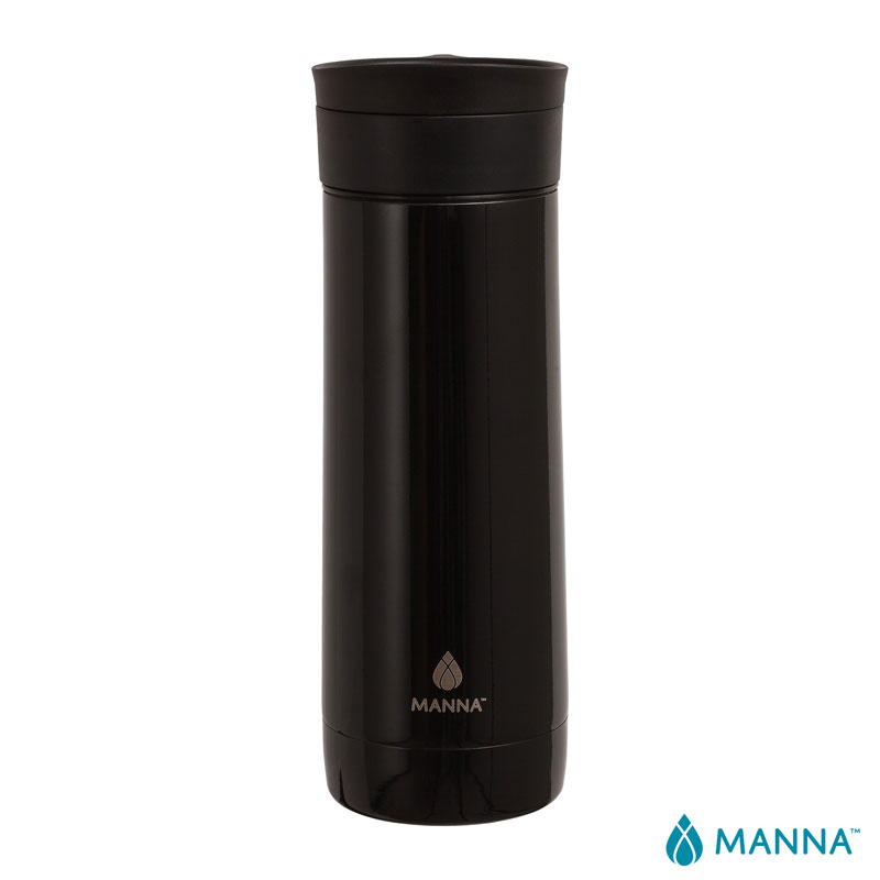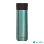The Manna 17 oz. Verve 18/8 stainless steel coffee mug has a unique (patents pending) twist-action seal lid. To take a quick sip, simply push the lever on the lid either direction and drink, push the lever back for a leak-proof seal. This innovative design allows for one-handed operation. In addition, this lid also features a lock that will keep your drink safe and secure for storage or transport. This tumbler’s double wall vacuum insulated construction keeps your cold drinks cold for 18 hours. Complies with Prop 65. 3 1/2″ W x 9 1/8″ H x 3″ D